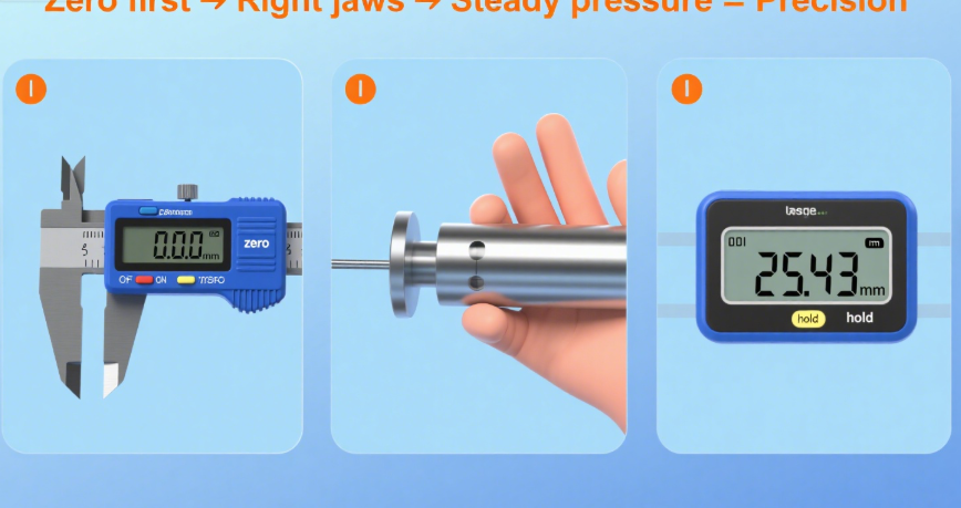 - Apply Steady, Even Pressure: Too much pressure bends the jaws (skewing results); too little means the jaws aren’t seated. Aim for a “firm but gentle” grip—digital calipers often have a “hold” function to lock measurements once set.