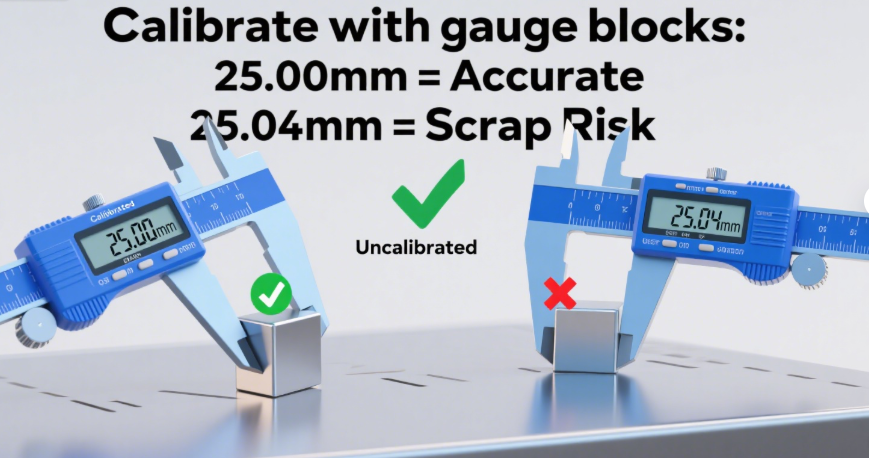 Calipers drift over time—dust, wear, and temperature changes throw off measurements. Calibrate regularly to avoid scrap: