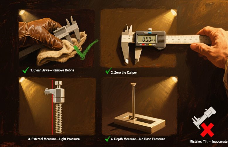 Even the best caliper will give bad readings if used wrong. Follow these steps for precision every time—using a digital caliper as an example (steps adapt easily to vernier/dial models):