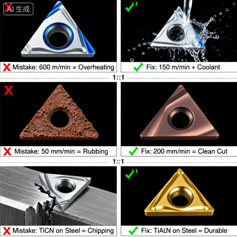 - Why It Happens: Carbide can handle heat, but excessive speed (e.g., 600 m/min for steel) melts the tool’s coating and softens the binder.