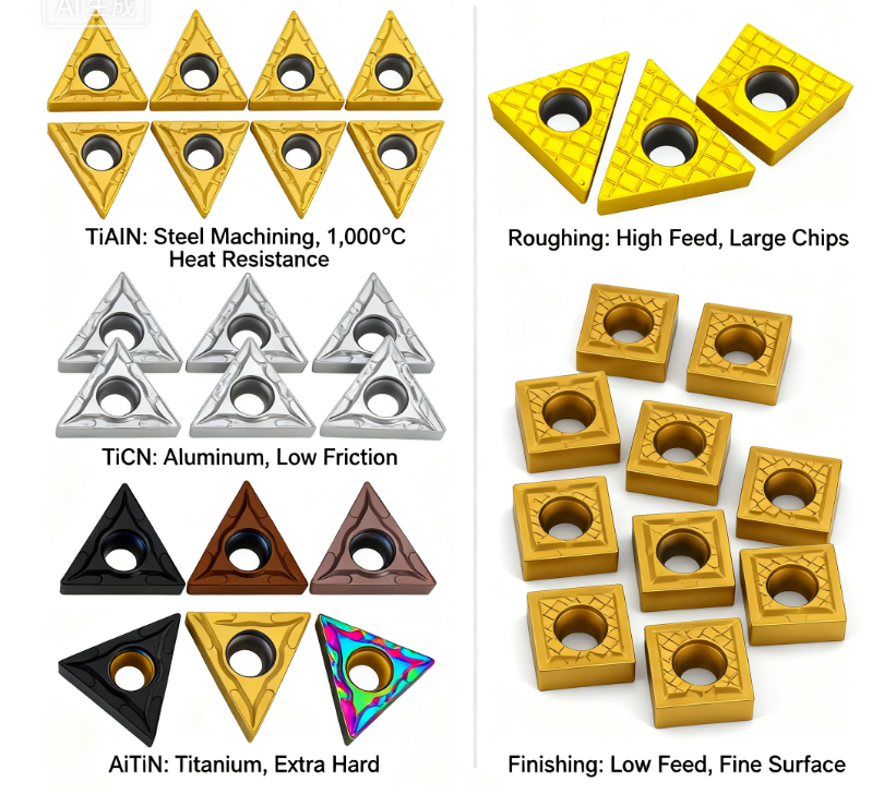 - TiAlN (Titanium Aluminum Nitride): Golden color, heat – resistant to 1,000°C. Best for steel, stainless steel, and high – speed machining.