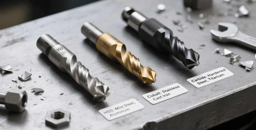 - High – Speed Steel (HSS): Affordable and versatile, HSS bits handle mild steel, aluminum, and wood. They work best at lower speeds (around 300–500 RPM for metal) and can be sharpened repeatedly.