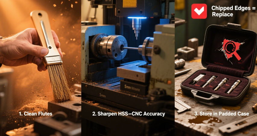 A quality end mill is an investment—with proper care, it can last for thousands of cuts. Here’s how to maintain it: