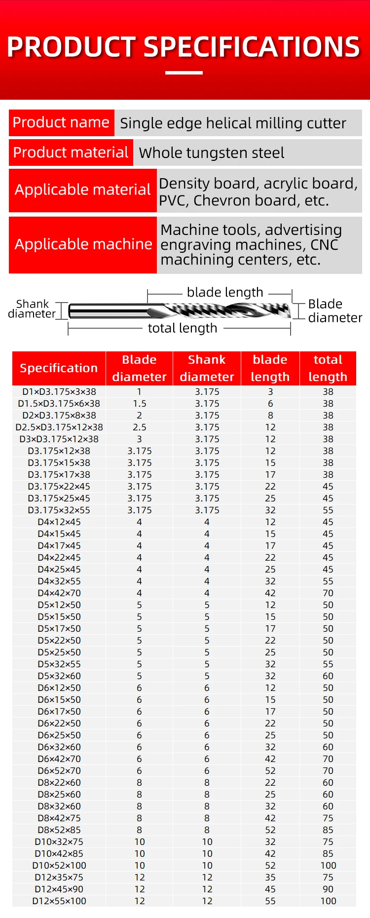 成为第一个“Acrylic PVC Density Board Woodworking Single-edge Left-turn Spiral Engraving Down Milling Cutter for Cnc Router” 的评价者