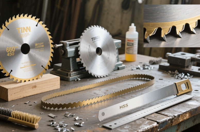HSS blades are often coated with TiN (titanium nitride) to reduce friction and wear, enhancing performance on non-ferrous metals.