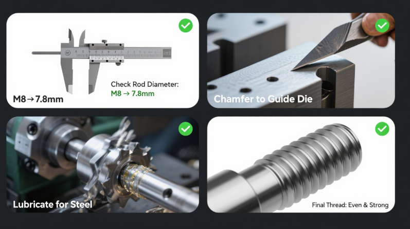 Just as with taps and pilot holes, using the correct diameter of the workpiece is non-negotiable for clean, strong threads. If the rod is too thick, the die will bind and overheat; if too thin, the threads will be weak and prone to stripping. Reference a die workpiece size chart—for example:- ¼”-20 UNC external thread → 0.213” (5.41mm) rod diameter