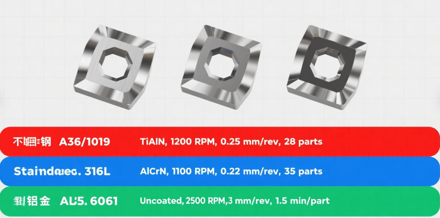 • Steel (A36, 1018): TiAlN-coated (1,200 RPM, 0.25 mm/rev) = 2.1 min/part, 28 parts/insert.​