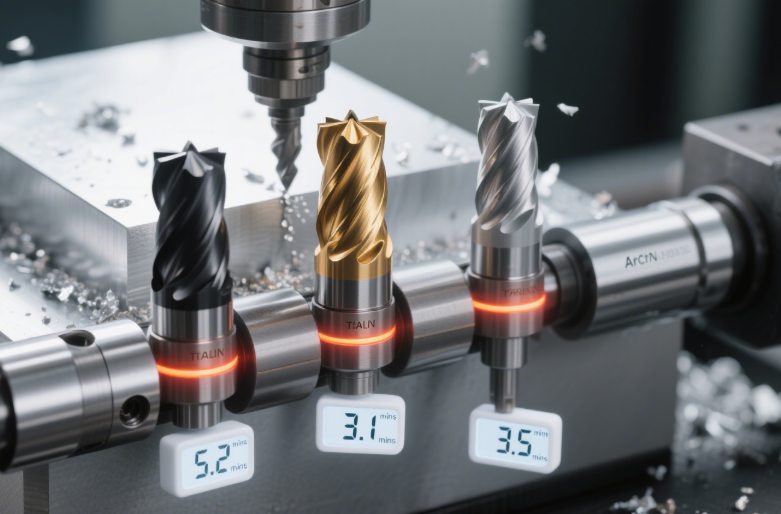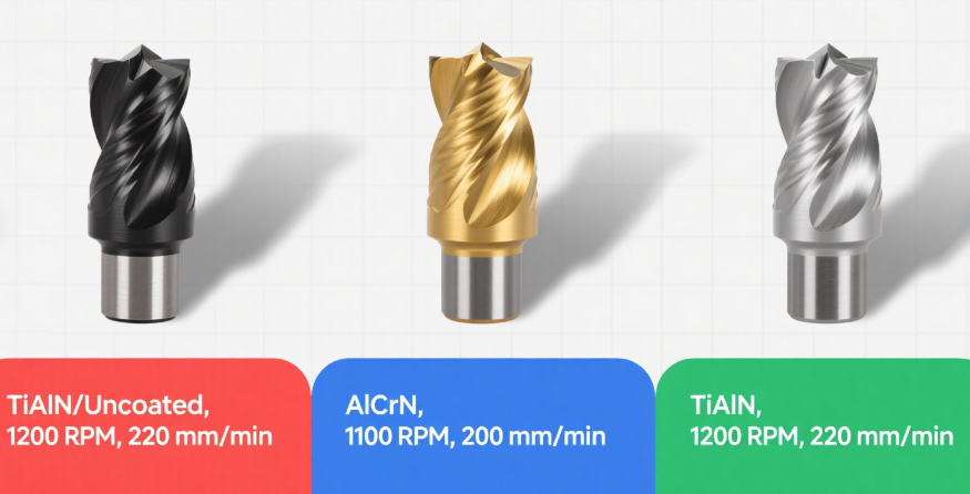 We put three types of end mills to the test: uncoated carbide, TiAlN – coated, and AlCrN – coated. The task was to mill a 100mm×100mm×10mm block of 6061 aluminum at a constant depth of cut of 2mm. Here’s what the stopwatch and sensors revealed: